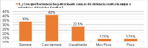 Con referencia a la primera interrogante al respecto de la frecuencia sobre el patrocinio en causas de violencia contra la mujer o miembros del núcleo familiar, el 40% de los abogados investigados lo que corresponde a la mayoría, se refieren que casi siempre han patrocinado causas de violencia contra la mujer o miembros del núcleo familiar en el cantón Santo Domingo. Lo que permite determinar que el principio de contradicción en las audiencias de juzgamiento de violencia contra la mujer o miembros del núcleo familiar es vulnerado y que esto surge con frecuencia, al existir un índice considerable de este tipo de audiencias (figura 1).