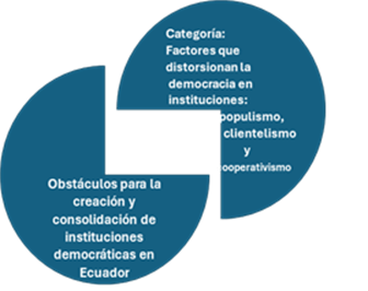 De acuerdo a la figura 3, al examinar los principales obstáculos para la creación y consolidación de instituciones democráticas en Ecuador, se identifica que factores como el populismo, el clientelismo y el cooperativismo afectan directamente el desarrollo de un sistema democrático. Estos elementos distorsionan la democracia y dificultan la correcta aplicación del principio de legalidad dentro del Estado de Derecho, ya que influyen en la forma en que se gobierna. De modo que, la existencia de estos obstáculos impide que las instituciones democráticas se establezcan y funcionen adecuadamente. De acuerdo con este criterio, se define la categoría: factores que distorsionan la democracia en instituciones: populismo, clientelismo y cooperativismo.