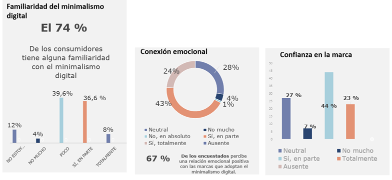 La confianza emerge como un factor determinante en la relación entre las marcas y sus audiencias. Los datos muestran que los consumidores familiarizados con el minimalismo digital tienden a confiar más en las marcas que lo aplican, percibiéndolas como más auténticas, coherentes y respetuosas del tiempo de su público. Esta confianza se ve reforzada cuando la comunicación se percibe como transparente y alineada con el bienestar del consumidor. Así, el minimalismo digital no solo optimiza la comunicación, sino que también fomenta la lealtad y la fidelización hacia la marca.