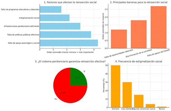 De manera similar, la ausencia de oportunidades de empleo se presenta como el principal obstáculo que afrontan los exreclusos al tratar de reintegrarse a la sociedad. Este dato enfatiza la importancia de crear alianzas estratégicas entre el sector privado, las entidades sociales y el Estado para crear lugares laborales inclusivos. Además, es necesario crear incentivos para las compañías que empleen a personas con antecedentes penales y fomentar el emprendimiento individual como un medio alternativo de supervivencia digna. El riesgo de que la persona vuelva a cometer el delito aumenta significativamente y cualquier esfuerzo de rehabilitación se ve limitado si no hay oportunidades de trabajo.