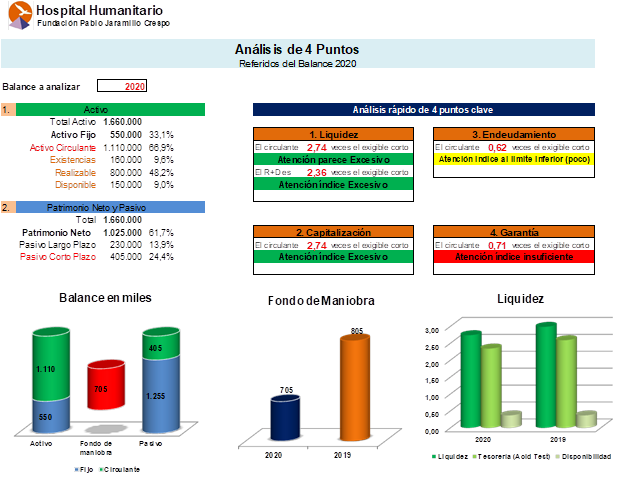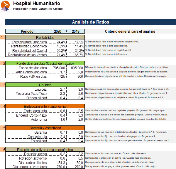 Con este análisis se pretende entregar al Hospital Humanitario una herramienta que le permita una toma de decisiones oportuna, así como también el poder ejecutar acciones preventivas y correctivas al encontrar desviaciones en los ratios analizados.