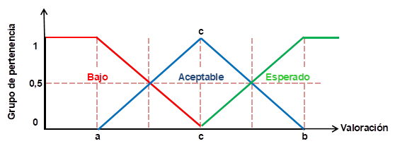 Una vez establecidos los rangos de las variables de incidencia así como sus grados de pertenencia, se determina el rango de los niveles para los términos difusos que permita posicionar los valores obtenidos de cada ratio en cuatro niveles: deficiente, bajo, aceptable, esperado; datos que se obtendrán de la conversión en términos difusos de los ratios financieros a analizar, así como se puede observar en la figura 6.