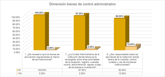 Para los funcionarios públicos del área administrativa de las entidades desconcentradas, el 100% considera que es necesario que los bienes se encuentren regularizados al interior de las instituciones, 97,50% manifiesta que la unidad administrativa es la encargada entre otras actividades de la recepción, registro, custodia, control, administración, egreso o baja de los bienes o inventarios, 90% estima que son responsables todos los servidores de la institución donde laboran de la custodia, cuidado y uso de los bienes institucionales.
