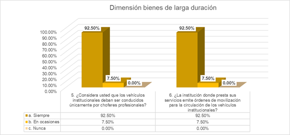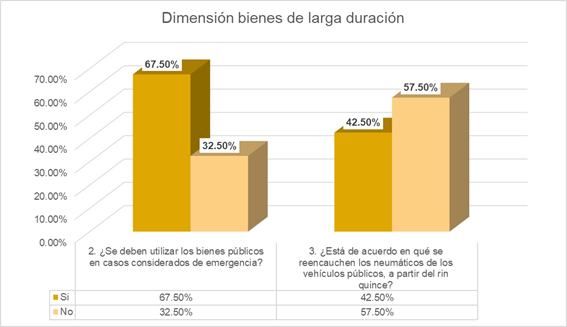 En cuanto a esta dimensión 67,50% de los encuestados, manifiesta que se deben utilizar los bienes públicos en casos considerados de emergencia, el 42,50% de los servidores consultados está de acuerdo en que se reencauche los neumáticos de los vehículos púbicos, 92,50% considera que los vehículos institucionales deben ser conducidos únicamente por choferes profesionales, 92,50% de los encuestados indica que la institución donde prestan sus servicios emite ordenes de movilización para los vehículos institucionales.