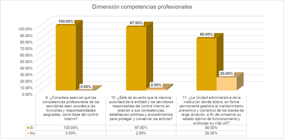 Referente a las competencias profesionales, el 100% considera esencial que las competencias profesionales sean acordes a las funciones y responsabilidades asignadas, 97,50% está de acuerdo que la máxima autoridad y los servidores responsables del control interno establezcan políticas para proteger y conservar los activos, 80% indica que la unidad administrativa de la institución donde labora gestiona el mantenimiento preventivo y correctivo de los bienes de larga duración.