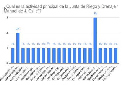 En este caso el 85 % de las encuestas respondieron que la actividad principal de la junta de riego es dar servicio de riego a los usuarios, el 15 % restante respondió en tecnificación y administración.