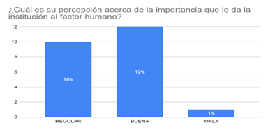 La siguiente pregunta esta relaciona con la parte laboral de la institución del cual da un porcentaje positivo, el 12 % de las encuestas respondieron si le dan importancia los trabajadores, el 10 % en regular y un 1 % respondieron negativamente, resolviendo que la empresa si da importancias a sus empleados.