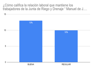 Esta pregunta es sobre cómo se relacionan los empleados o cual es el ambiente que se vive en la junta de riego y drenaje. Se obtuvo una respuesta positiva por lo tanto el 56 % de las encuestas respondieron si hay una buena relación en compañeros de trabajo, el 44% dijeron regular y el 0 % dijeron mala relación.