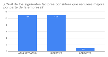 Esta pregunta se trata de analizar la parte más vulnerable de la empresa, por lo que respondieron que la parte que hay que intervenir es el área administrativa y directiva con un 40 % cada una, la operativa tiene un porcentaje de 10 % el cual no ha tenido problema en su área.
