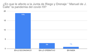 En esta pregunta se hace referencia al problema que está afectando a nivel mundial donde muchas empresas se vieron afectadas de una u otra manera, en la junta de riego y drenaje no es la exención, el cual respondieron de la siguiente manera. El 80 % respondieron que se vio afectada en el económico, el 15 % en lo operativo y un 5 % no se vio afectada por la pandemia.