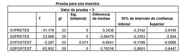 Al existir significancia bilateral para el grupo experimental (G1POSTEST) de 0,011 en comparación a los otros grupos que permanecieron en 0, se evidencia cambio estadístico, lo cual implica que el tratamiento aplicado fue efectivo en la muestra poblacional.