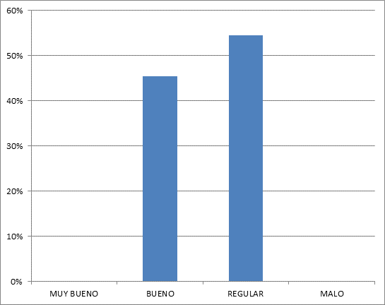 Los encuestados respondieron que el sistema de contratación pública es regular, con un porcentaje de respuestas del 54,55%, de los 11 funcionarios encuestados, mientras que en un 45,45% de encuetados indicaron que era bueno el sistema en procesos de contratación, en los parámetros de muy bueno y malo no hubo respuesta obteniendo el 0%.