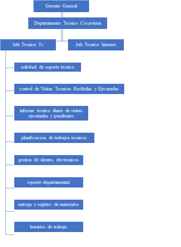 Es evidente la falta de manejos de procesos en el departamento técnico de la empresa Cocavision, de ahí la importancia de realizar un sistema de gestión de procesos que beneficie a la empresa y sus miembros. Previa verificación se accedió a mucha información la cual nos guio a gestionar un adecuado proceso de gestión. De la información Verificada se evidencia la falta de control, pequeñas falencias en su accionar, falta sus procesos, registro de trabajos manuales sin verificación, desorden y desperdicios de materiales y equipos, y a pesar de su gran aceptación en el mercado necesitan corregir dicho departamento de manera urgente.