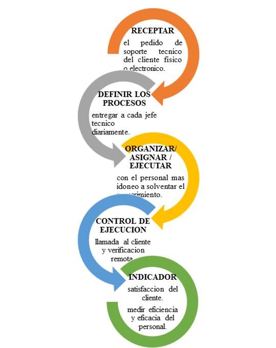 En el diagnóstico realizado dentro de la institución se evidencia a todo el personal técnico realizando trabajos dentro de la empresa, procesos que se están desarrollando de manera empírica, sin tener procedimientos mínimos o máximos que permita efectuar un control estricto de cumplimiento, lo cual es contradictorio a lo expuesto por (Zapa-Pérez, 2014), quien determina que las organizaciones al tener gestión por procesos definidos y estandarizados influyen positivamente en el impacto de todos los procesos diarios que se realizan y en la innovación, por cuanto permiten generar valor agregado a los procesos en busca de incrementar la productividad y la satisfacción de los clientes.