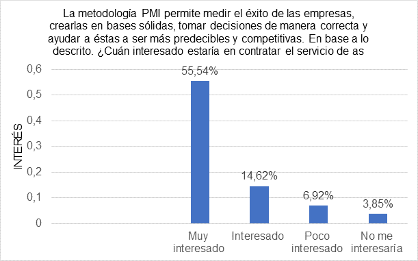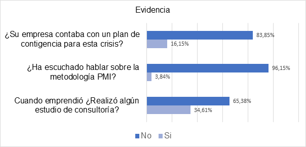 De acuerdo con los resultados expresados en las figuras anteriores se puede destacar que para muchos de los emprendedores y sus microempresas analizadas invertirían en adquirir los servicios de una consultoría basada en una metodología que les permita mantenerse en el mercado, tal como lo hace la metodología Project Management Institute (PMI), lo que permite analizar las variables de viabilidad e interés de este segmento de mercado. Además, se evidencia que la mayoría de estas empresas no contaban con un plan de contingencia para enfrentar la pandemia por Covid-19. Así como para realizar sus emprendimientos. Un porcentaje considerable que representa el 34,61 % de una muestra de 130 microempresas investigadas, no realizaron un estudio de viabilidad sobre el mercado. Con respecto a la metodología a aplicar en la presente de investigación existe un total de 96,15% que desconoce la metodología del PMI. Pese a que el 60%de las microempresas investigadas han tenido una expectativa mayor a la que pensaban cuando emprendieron, existe un porcentaje del 15,38% de las microempresas que ha tenido expectativas menores o las que se plantearon a la hora de emprender, lo que fortalece el presente estudio, que se dirigirá a identificar las posibles debilidades que han tenido en el proceso de emprendimiento y desarrollo. Por otro lado, el 46,92% mayoría de microempresas apuntaron los declives de los negocios en los tres años de vida, a las medidas político-económicas, existe un porcentaje notable que opina que esto se debe a no haber realizado un estudio de mercado con anterioridad, lo que indica que existe un fuerte segmento de mercado que contrataría servicios que le oriente a esta actividad para medir la viabilidad de sus negocios con anterioridad.