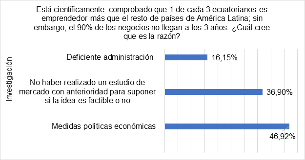 Está científicamente comprobado que 1 de cada 3 ecuatorianos es emprendedor más que el resto de países de América Latina; sin embargo, el 90% de los negocios no llegan a los 3 años. ¿Cuál cree que es la razón? |